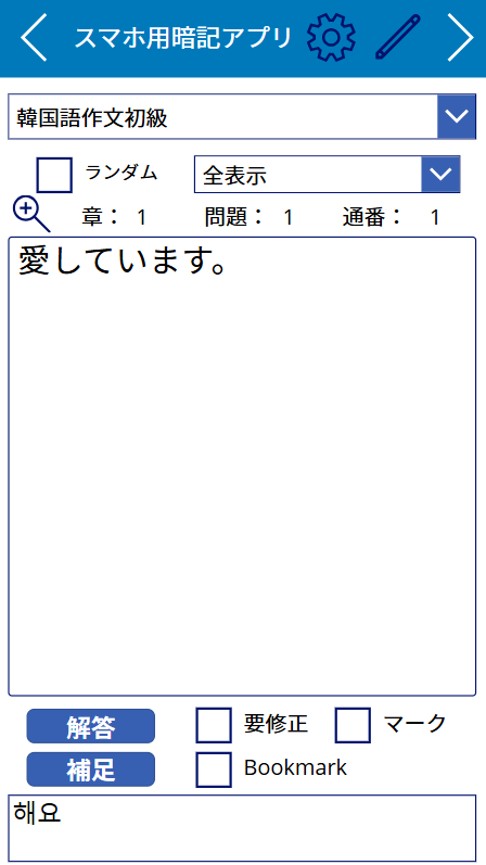 しかし、この本を常に持ち歩くのは不便で、ちょっとした隙間時間にも気軽に勉強したいという思いがありました。そこで、スマホで暗記ができないかと考え、「暗記メモ帳アプリ」を自作することを思い立ちました。教科書の韓国語文と日本語を、順番またはランダムに表示するカード暗記アプリです。